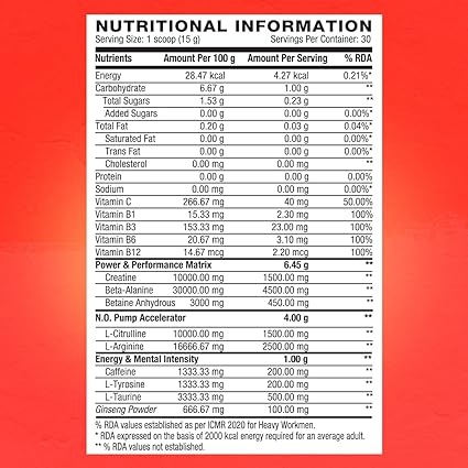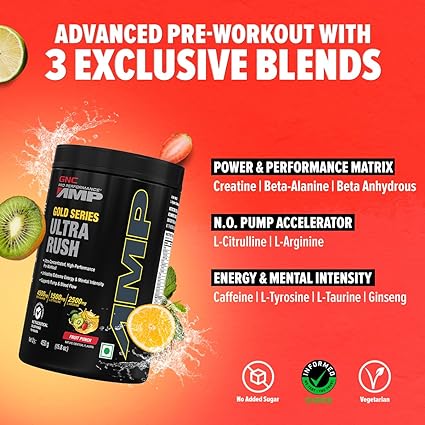 Brand GNC Flavour Fruit Punch Net Quantity: 450.0 gram Item Form: Powder Item Weight: 450 Grams Item Dimensions: LxWxH 10.5 x 10.5 x 16.5 Centimeters Package Information: Packet Number of Items: 1 Material Feature: Vegetarian *SUPERIOR PRE-WORKOUT WITH 3 UNIQUE BLENDS: GNC AMP Ultra Rush (30 Servings) is specifically formulated with three exclusive blends, including Power & Performance Matrix, N.O. Pump Accelerator, and Energy & Mental Intensity, which gives your body an insane level of physical & mental boost for a hard-core workout performance and incredible muscle gains . *MAXIMISES RECOVERY & MUSCLE GROWTH: GNC's Ultra Rush contains the Power & Performance Matrix Blend formed by Creatine, Beta-alanine, and Betaine Anhydrous, which adds maximum muscle strength and speeds up your post-workout recovery for building jumbo-sized muscles quicker. *EXTRAORDINARY ENERGY & STAMINA: The Nitric Oxide Pump blend with L-Citrulline & L-Arginine boosts oxygen supply towards muscles by widening the blood vessels. As a result, these muscles feel an all-powerful surge of energy and endurance to make way for a remarkable workout potential. *INTENSIFIES MENTAL FOCUS & COMBATS FATIGUE: GNC's Ultra Rush features the Energy & Mental Intensity Blend made of Caffeine, L-Tyrosine, and L-Taurine, which drives your mind to stay focussed on the workout. It keeps your body's energy tank fuel to tirelessly work towards your fitness goals.