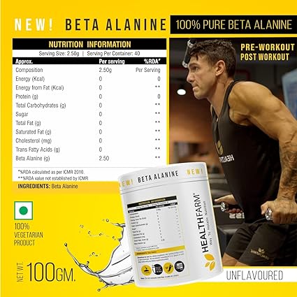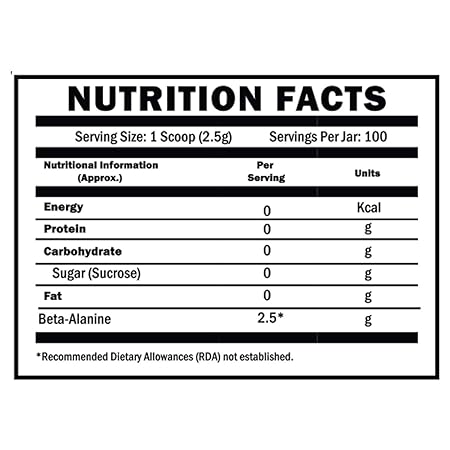 Brand SCITRON Flavour Unflavoured Net Quantity 1 count Item Form Powder Item Weight 250 Grams Item Dimensions LxWxH 8.1 x 8.1 x 13.2 Centimeters Diet Type Vegetarian Product Benefits Enhances performance by increasing exercise capacity and decreasing muscle fatigue Age Range (Description) Adult Number of Items 1 About this item *Beta-alanine is a non-essential amino acid that is produced naturally in the body *Enhances performance by increasing exercise capacity and decreasing muscle fatigue *Aids in the production of carnosine *Plays an important role in muscle endurance in high-intensity exercise