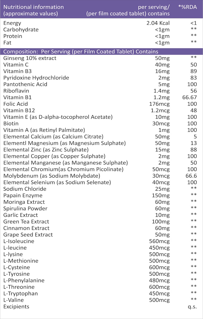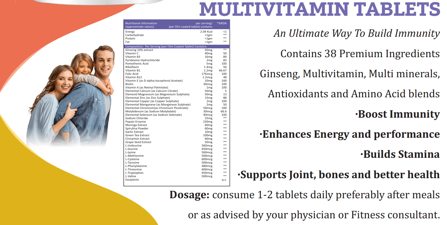 *Premium Multivitamin Blend: Zedon Nutrition Multivitamin Tablets feature a robust blend of 38 premium ingredients, including Ginseng, Multivitamins, Minerals, Antioxidants, and Amino Acids. *Wellness Support: Our formula is designed to boost energy levels, enhance immunity, improve performance, stamina, and promote joint health for a comprehensive approach to well-being. *Immune System Support: The inclusion of antioxidants and essential nutrients helps fortify your immune system, contributing to better overall health. *Performance and Stamina: Achieve your fitness and daily performance goals with the added support of our multivitamin blend. *Joint Health: The unique combination of ingredients promotes joint health, fostering flexibility and mobility.